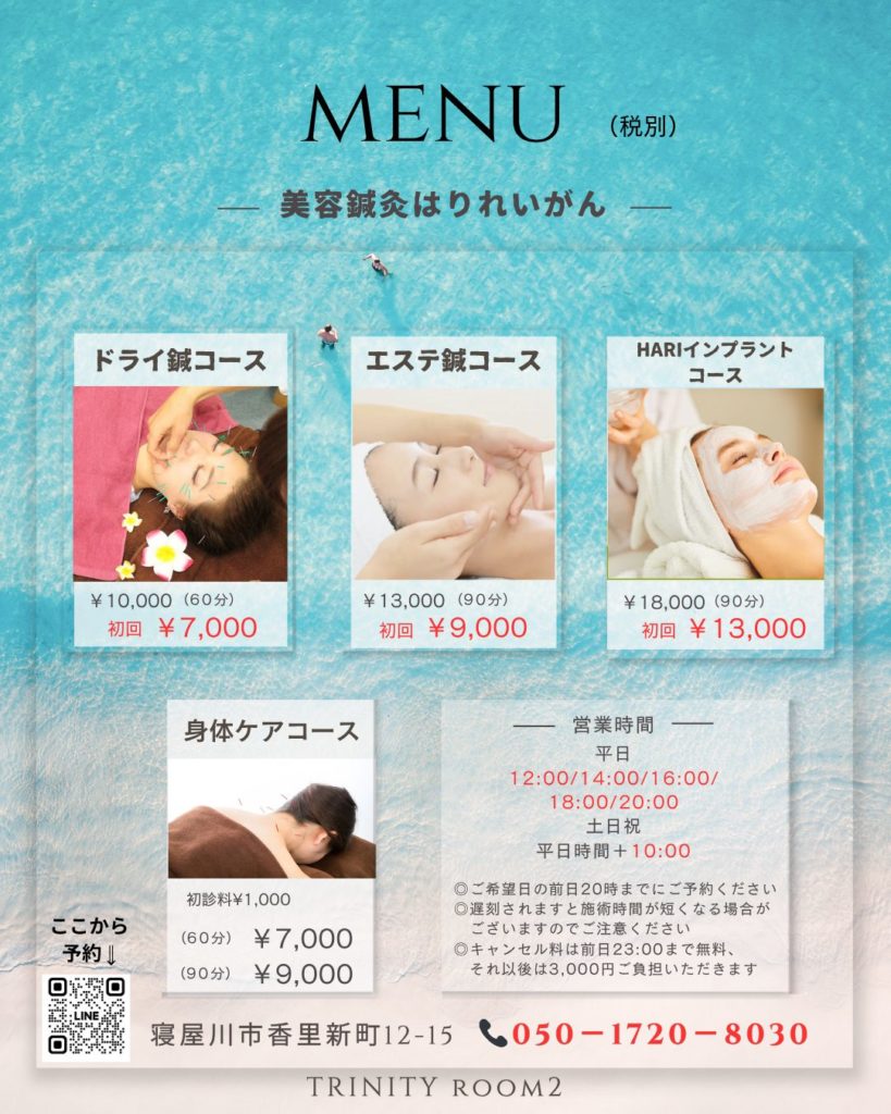 令和7年7月7日、寝屋川市の香里園駅から徒歩3分。美容鍼灸はりれいがん専門のサロンをオープンしました。
