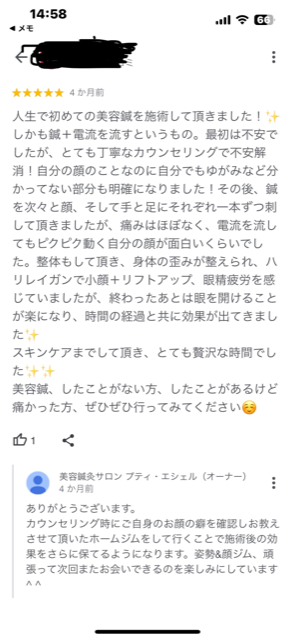 当サロンは、お客様の半数以上がご紹介されてお越しいただいていますが、時々SNSをご覧いただいてGoogleの口コミが良かったからとお問い合わせいただく方も増えてきました。